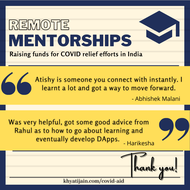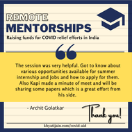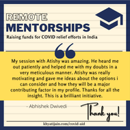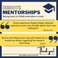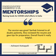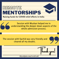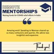 Prospective mentees can schedule a call to get help with Job applications, Resume reviews, Mock Interviews, Thesis/ Research Internship applications, MBA applications, GMAT/ GRE Prep and MS/PhD applications in the fields of engineering, science, finance, consultancy and management. We expect you to make a donation to any of the verified organisations providing relief during the pandemic and upload the receipt while booking the call. While we have no minimum amount set, the recommended amount is 500 - 5000 rupees. We understand a lot of you might not be able to donate such amounts (or not at all), we encourage you to donate as per your capacity, and add a note while booking the call! For any queries, dm me on instagram @jnkhyati